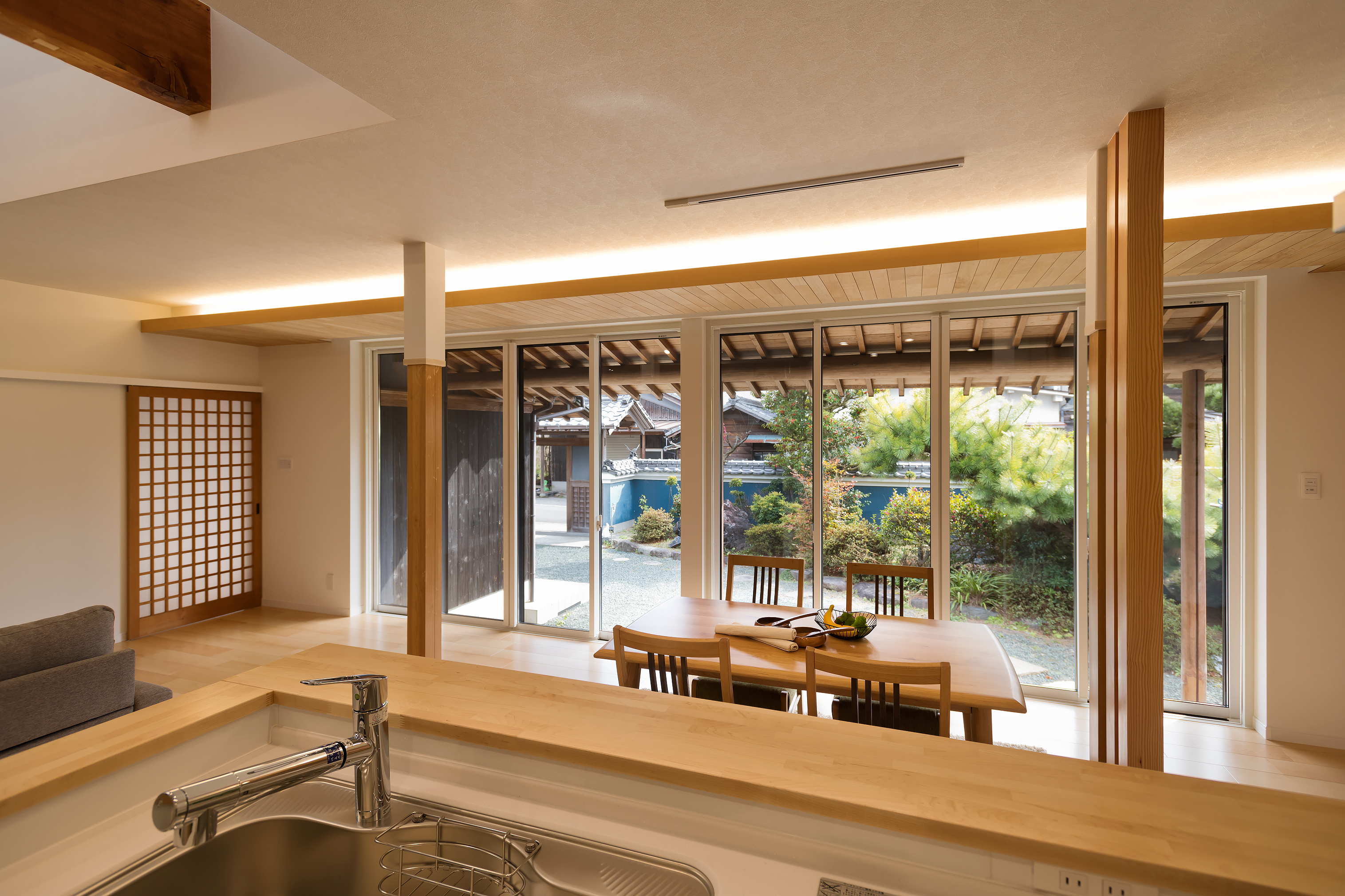 祖父母から受け継いだ純和風住宅で暮らしていたTさまファミリー。趣あるたたずまいとは裏腹に、トイレや浴室へと続く長い廊下は冬場の寒さが厳しく、北側のダイニングキッチンが暗いことも悩みでした。さらにもっとも日当たりの良い南側には二間続きの和室がありましたが、主に来客用のため、日常の生活空間としては活かされていないという状況。そこで今回のリノベーションでは、その和室を大デザインと機能を両立させて家族の日常をやさしく照らす空間ににLDKへと再構築。南面の光を最大限に採り込みながら、リビング上部に吹き抜けを設けることで高窓からも採光を確保し、空間全体に光がめぐる設計としまし た。キッチンからは日本庭園を臨める配置とし、料理をしながら四季を感じられる贅沢なひとときを実現しています。またキッチン裏手に洗面室・脱衣室を配置し、トイレ、ウォークインクローゼット、寝室へとつながる回遊動線を計画。生活感を抑えながらも使いやすさはしっかりと高め、「1階で生活を完結させたい」というTさまの要望を満たしました。