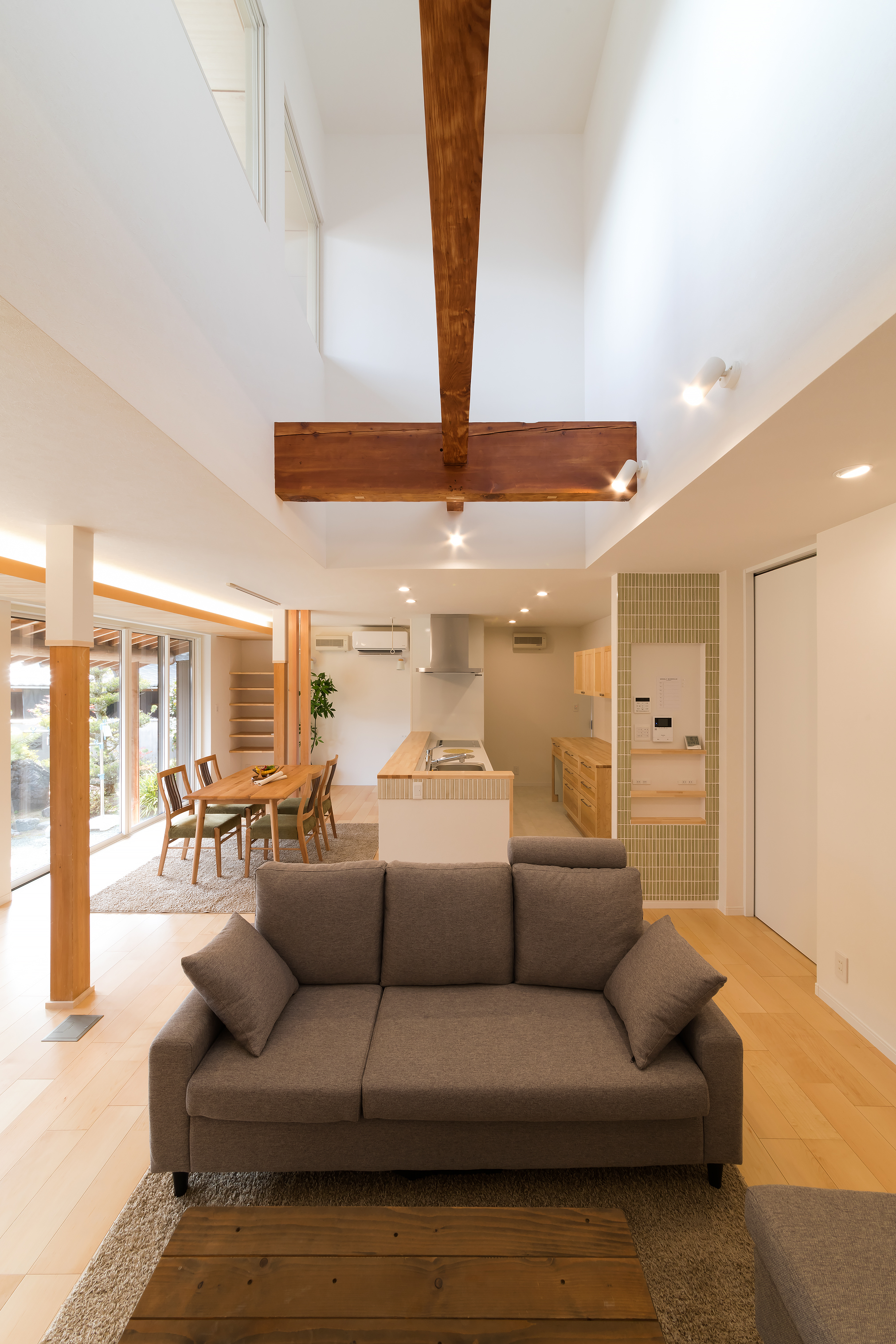 二間続きの和室をLDKに変更。ダイニン グの上部を吹き抜けとし、既存の梁をあ らわしに。必要な柱や梁を違和感なく残し、 新旧の設えを巧みに融合させています