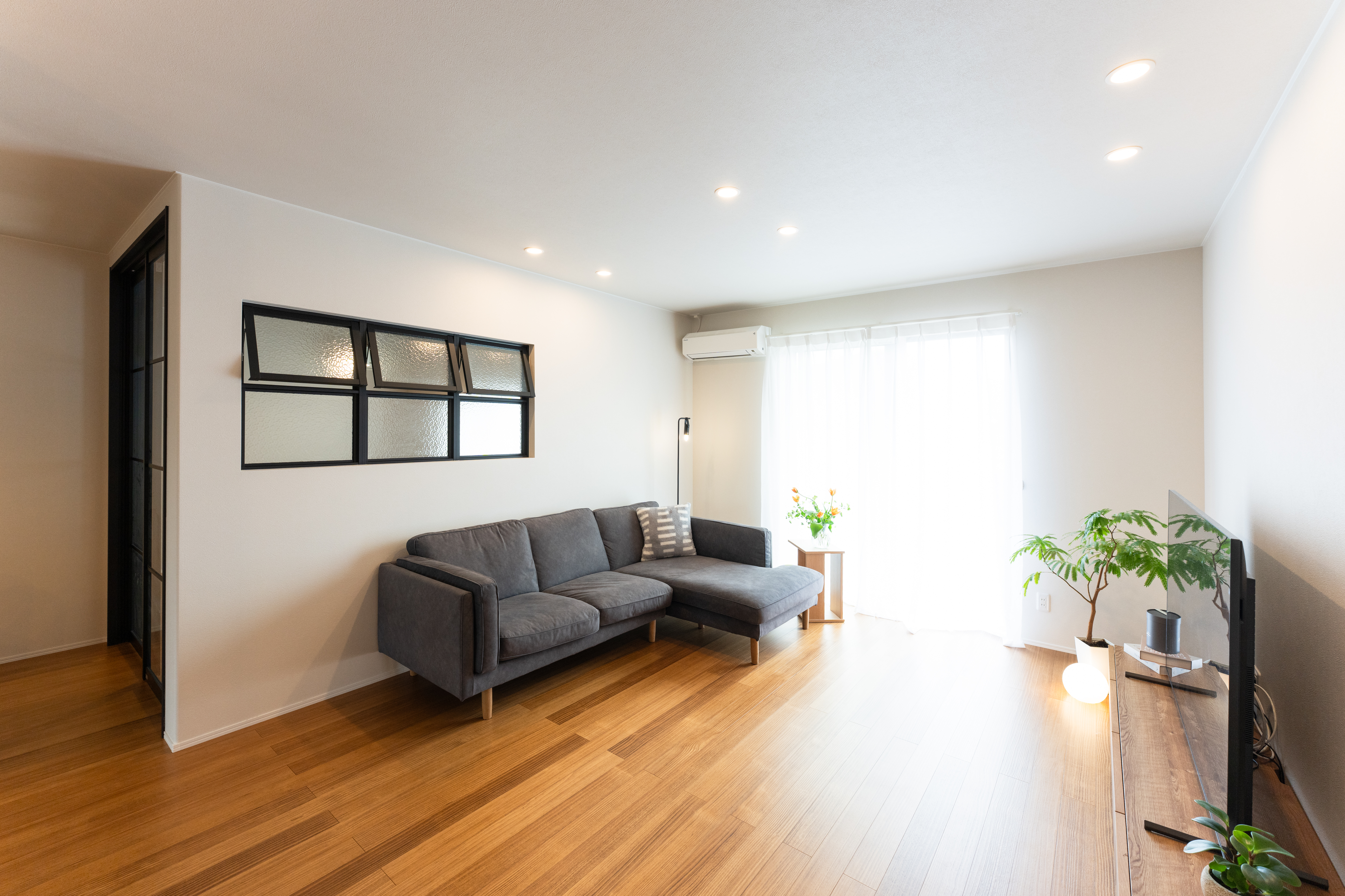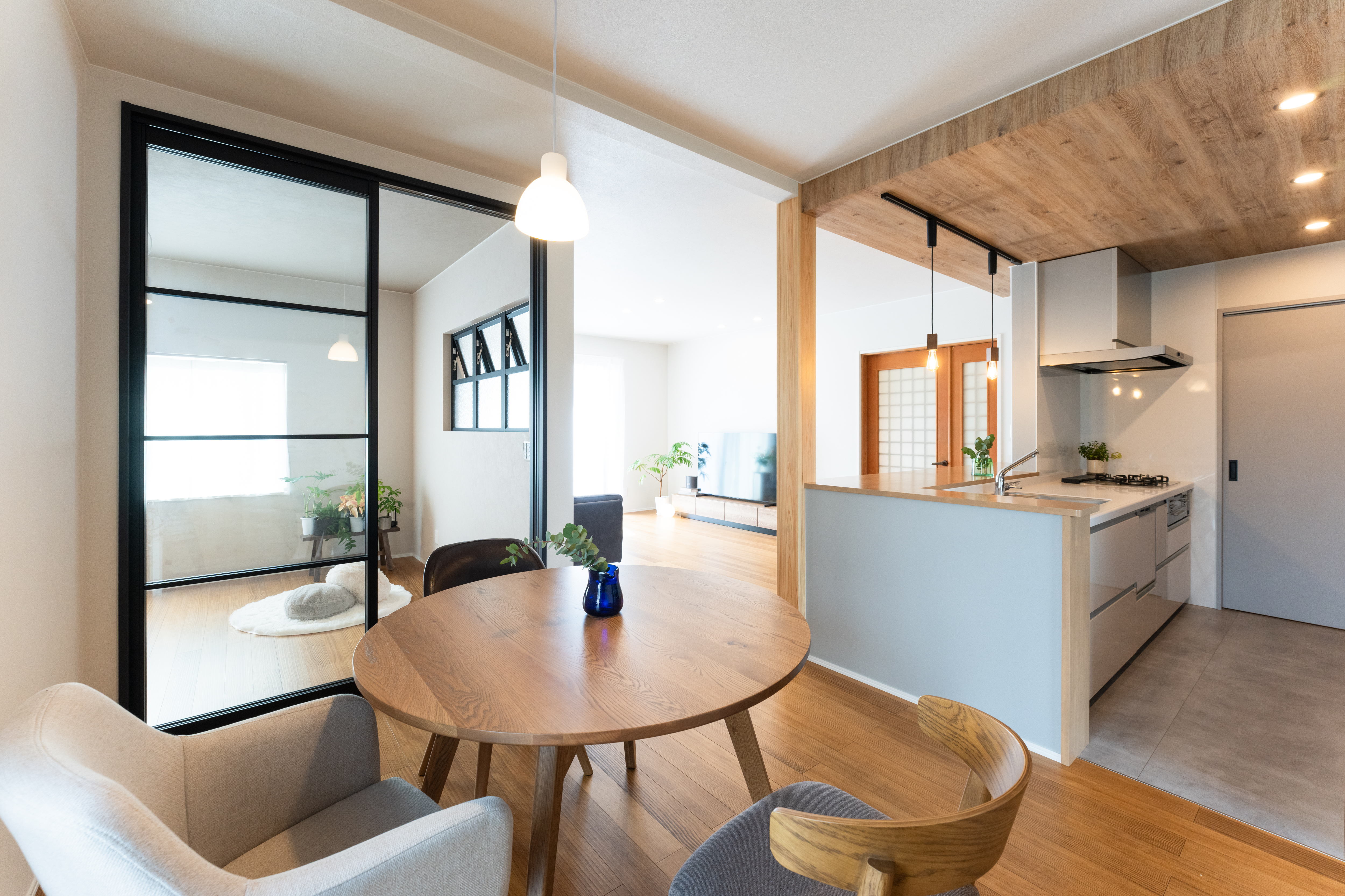 不便を解消し理想以上を叶えたフルリノベーション、元は純和風住宅でしたが、 ずっとカフェ風の家に憧れていたSさま。お子さんも独立し、セカンドライフを理想の 空間で叶えるため、リノベーションを決意されました。工務店は複数検討しましたが、LDKの隣に寝室を配置し、室内窓でゆるやかにつなげるという松井建設のサプライズなプランに惹かれ、依頼を決めたそう。ワンフロアのLDKには念願の対面キッチンを構え、水まわりへの回遊動線など使い勝手も向上。構造上抜けない壁や柱の存在を感じさせない設計により、開放感のある空間を実現しました。