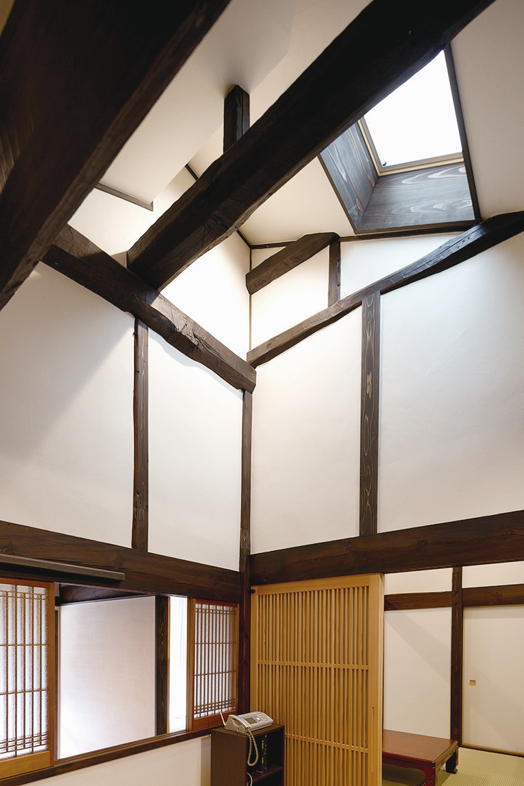 家族が集まるリビングは天井を抜き、天窓も設けて明るく広く。新調する必要のあったキッチンカウンターや格子戸などの建具は、既存の梁や柱の味わいを損なわないように無垢材で造作。新旧の手仕事が融合した住まいへと生まれ変わりました。