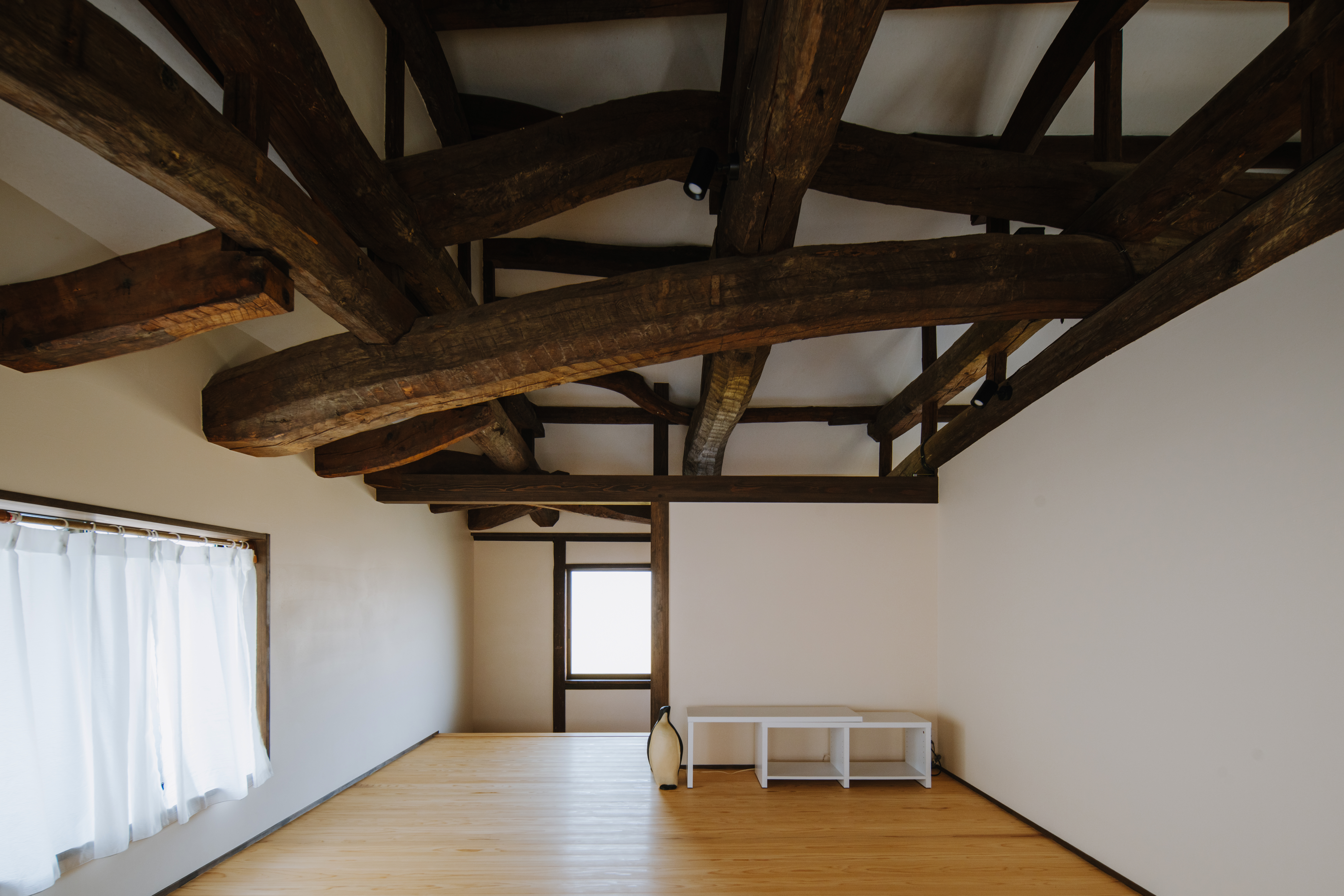 蚕を育てていた2階の天井は低か ったものの、天井板を外して梁を 見せることにより、開放感のある 吹き抜けが生まれました